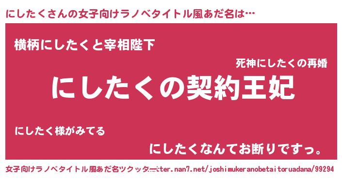 | 男性向けラノベタイトル風あだ名 | 『にしたくという概念が存在しない退屈な世界 』 |