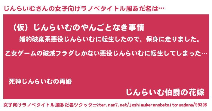 | 男性向けラノベタイトル風あだ名 | 『魔弾の王とじんらいむ』 |
