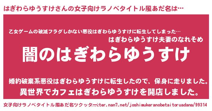 | 男性向けラノベタイトル風あだ名 | 『Re:はぎわらゆうすけから始める異世界生活』 |