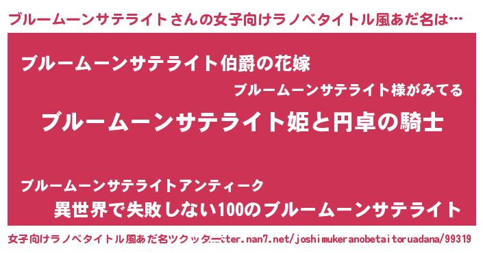 ブルームーンサテライトさんの女子向けラノベタイトル風あだ名は… 『ブルームーンサテライト姫と円卓の騎士』『ブルームーンサテライト伯爵の花嫁』『異世界で失敗しない100のブルームーンサテライト』 ツクッター #女子向けラノベタイトル風あだ名ツクッター http://tkutter.nan7.net/joshimukeranobetaitoruadana/99319/