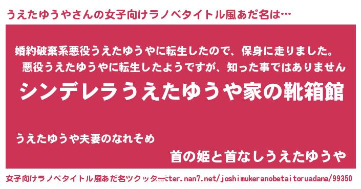 うえたゆうやさんの女子向けラノベタイトル風あだ名は… 『シンデレラうえたゆうや家の靴箱館』『婚約破棄系悪役うえたゆうやに転生したので、保身に走りました。』『首の姫と首なしうえたゆうや』 ツクッター #女子向けラノベタイトル風あだ名ツクッター http://tkutter.nan7.net/joshimukeranobetaitoruadana/99350/