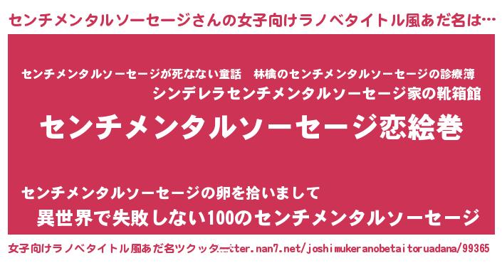 | 男性向けラノベタイトル風あだ名 | 『おまえをオタクにしてやるから、俺をセンチメンタルソーセージにしてくれ! 』 |