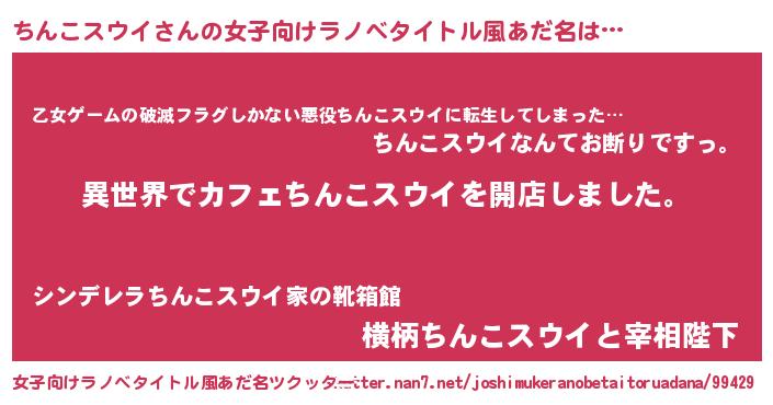ちんこスウイさんの女子向けラノベタイトル風あだ名は… 『異世界でカフェちんこスウイを開店しました。』『乙女ゲームの破滅フラグしかない悪役ちんこスウイに転生してしまった…』『横柄ちんこスウイと宰相陛下』 ツクッター #女子向けラノベタイトル風あだ名ツクッター http://tkutter.nan7.net/joshimukeranobetaitoruadana/99429/