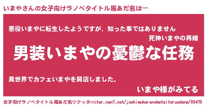 いまやさんの女子向けラノベタイトル風あだ名は… 『男装いまやの憂鬱な任務』『悪役いまやに転生したようですが、知った事ではありません』『いまや様がみてる』 ツクッター #女子向けラノベタイトル風あだ名ツクッター http://tkutter.nan7.net/joshimukeranobetaitoruadana/99470/