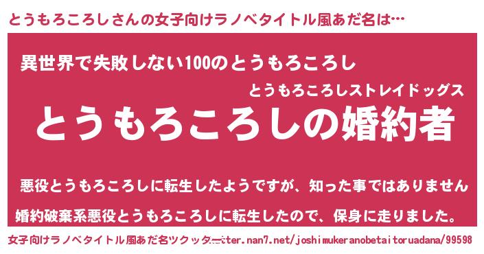 | 男性向けラノベタイトル風あだ名 | 『うちの娘の為ならば、俺はもしかしたらとうもろころしも倒せるかもしれない。』 |