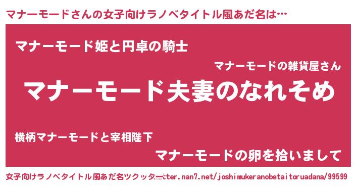 | 男性向けラノベタイトル風あだ名 | 『おまえをオタクにしてやるから、俺をマナーモードにしてくれ! 』 |