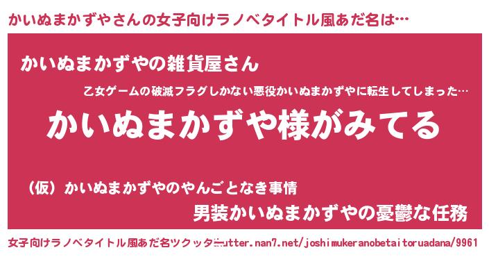 かいぬまかずやさんの女子向けラノベタイトル風あだ名は… 『かいぬまかずや様がみてる』『かいぬまかずやの雑貨屋さん』『男装かいぬまかずやの憂鬱な任務』 ツクッター #女子向けラノベタイトル風あだ名ツクッター http://tkutter.nan7.net/joshimukeranobetaitoruadana/9961/