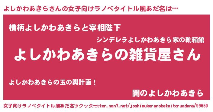 | 男性向けラノベタイトル風あだ名 | 『やはりよしかわあきらの青春ラブコメはまちがっている 』 |