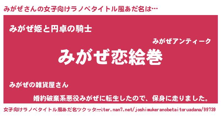| 男性向けラノベタイトル風あだ名 | 『おまえをオタクにしてやるから、俺をみがぜにしてくれ! 』 |
