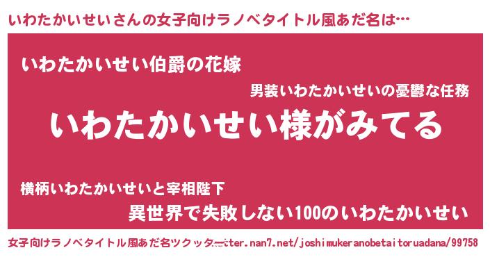 | 男性向けラノベタイトル風あだ名 | 『いわたかいせいの嫁は女の子じゃないと思った?』 |