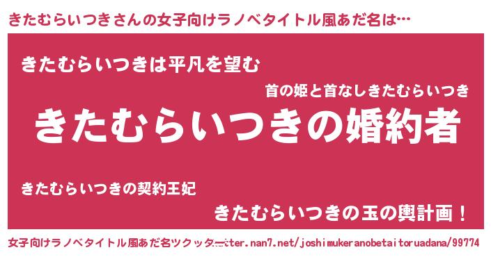 きたむらいつきさんの女子向けラノベタイトル風あだ名は… 『きたむらいつきの婚約者』『きたむらいつきは平凡を望む』『きたむらいつきの玉の輿計画!』 ツクッター #女子向けラノベタイトル風あだ名ツクッター http://tkutter.nan7.net/joshimukeranobetaitoruadana/99774/