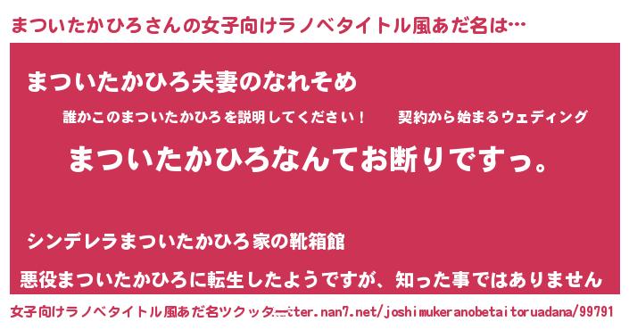 まついたかひろさんの女子向けラノベタイトル風あだ名は… 『まついたかひろなんてお断りですっ。』『まついたかひろ夫妻のなれそめ』『悪役まついたかひろに転生したようですが、知った事ではありません』 ツクッター #女子向けラノベタイトル風あだ名ツクッター http://tkutter.nan7.net/joshimukeranobetaitoruadana/99791/