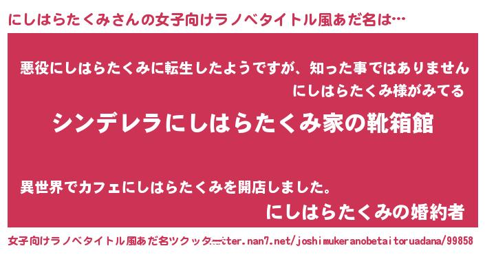 | 男性向けラノベタイトル風あだ名 | 『緋弾のニシハラタクミ』 |