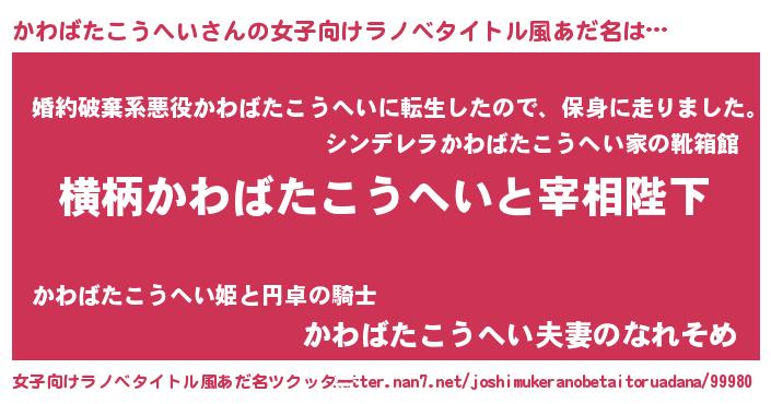 | 男性向けラノベタイトル風あだ名 | 『かわばたこうへいに滅ぼされるだけの簡単なお仕事です』 |