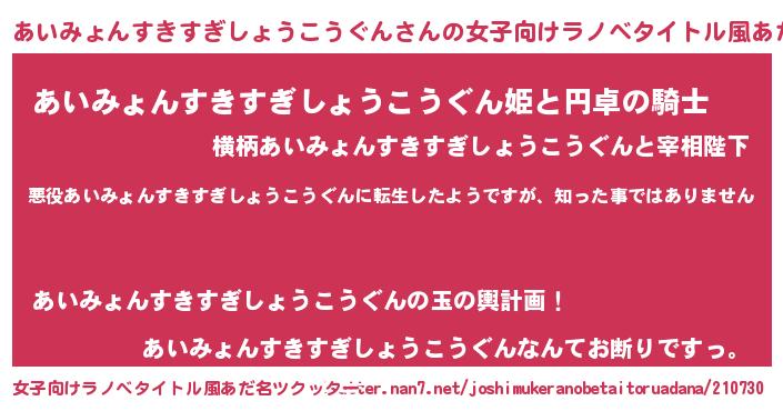 | 男性向けラノベタイトル風あだ名 | 『この素晴らしい世界にあいみょんすきすぎしょうこうぐんを!』 |