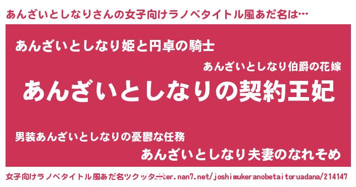 | 男性向けラノベタイトル風あだ名 | 『あんざいとしなりという概念が存在しない退屈な世界 』 |