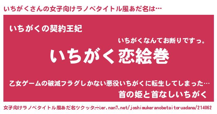 | 男性向けラノベタイトル風あだ名 | 『おまえをオタクにしてやるから、俺をいちがくにしてくれ! 』 |