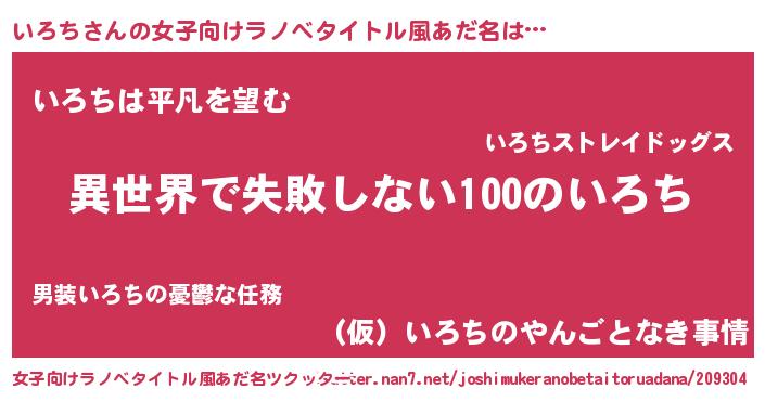 | 男性向けラノベタイトル風あだ名 | 『いろちという概念が存在しない退屈な世界 』 |