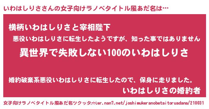 | 男性向けラノベタイトル風あだ名 | 『いわはしりさという概念が存在しない退屈な世界 』 |