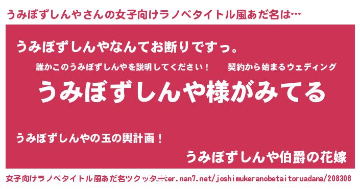 | 男性向けラノベタイトル風あだ名 | 『うみぼずしんやの嫁は女の子じゃないと思った?』 |