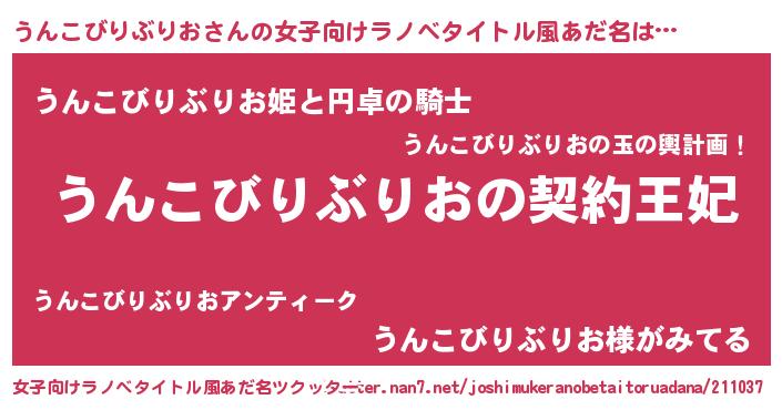 | 男性向けラノベタイトル風あだ名 | 『うんこびりぶりおという概念が存在しない退屈な世界 』 |