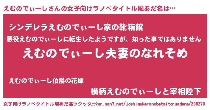 | 男性向けラノベタイトル風あだ名 | 『おまえをオタクにしてやるから、俺をえむのでぃーしにしてくれ! 』 |