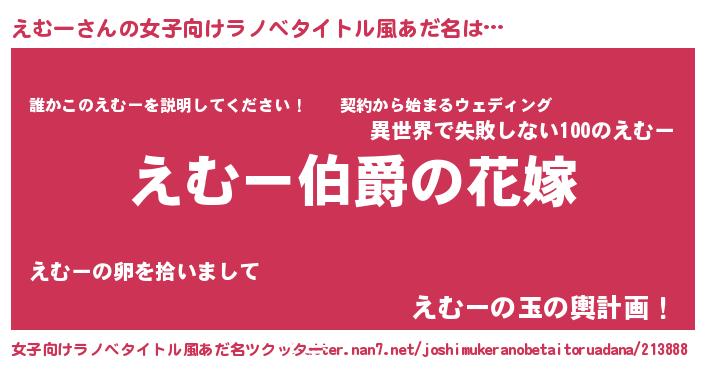 | 男性向けラノベタイトル風あだ名 | 『うちの娘の為ならば、俺はもしかしたらえむーも倒せるかもしれない。』 |