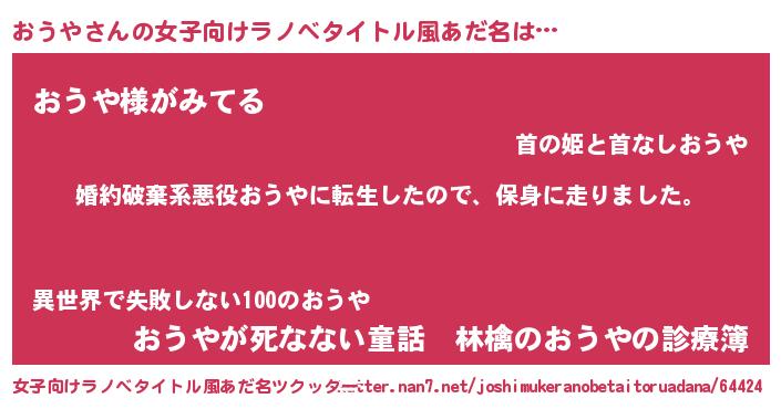 | 男性向けラノベタイトル風あだ名 | 『オウヤスレイヤー』『魔弾の王とおうや』 |