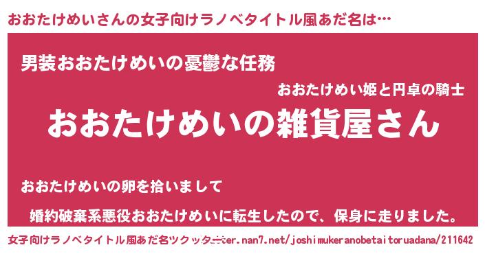 | 男性向けラノベタイトル風あだ名 | 『やはりおおたけめいの青春ラブコメはまちがっている 』 |