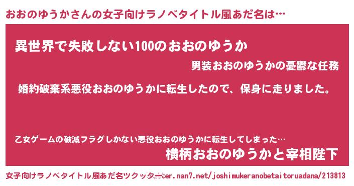 | 男性向けラノベタイトル風あだ名 | 『オオノユウカスレイヤー』 |
