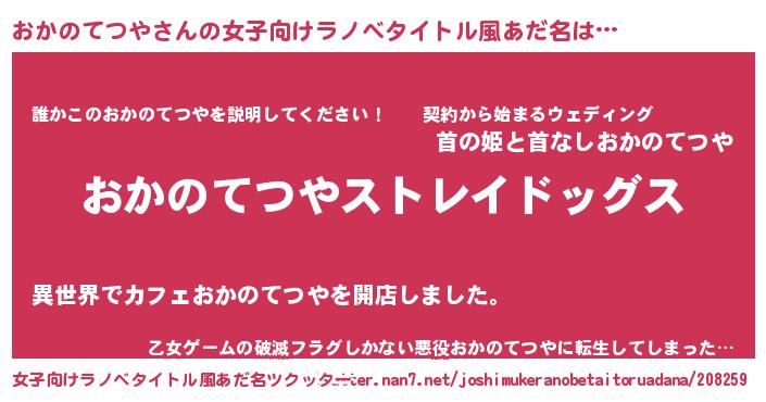 | 男性向けラノベタイトル風あだ名 | 『Re:おかのてつやから始める異世界生活』 |