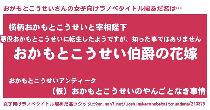 おかもとこうせいさんの女子向けラノベタイトル風あだ名は… 『おかもとこうせい伯爵の花嫁』『横柄おかもとこうせいと宰相陛下』『(仮)おかもとこうせいのやんごとなき事情』 ツクッター #女子向けラノベタイトル風あだ名ツクッター http://tkutter.nan7.net/joshimukeranobetaitoruadana/213879/