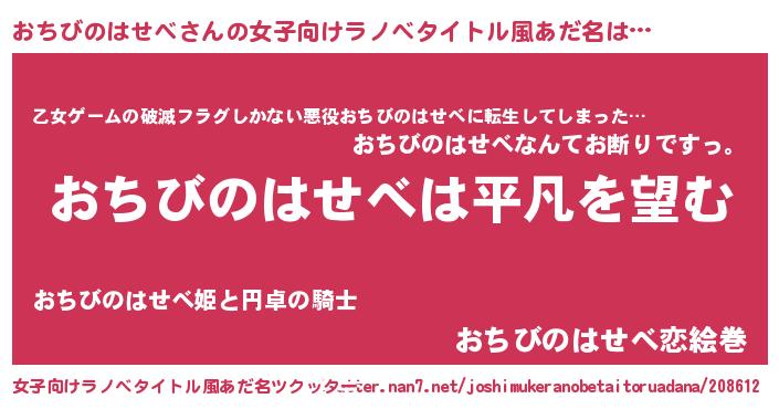 おちびのはせべさんの女子向けラノベタイトル風あだ名は… 『おちびのはせべは平凡を望む』『乙女ゲームの破滅フラグしかない悪役おちびのはせべに転生してしまった…』『おちびのはせべ恋絵巻』 ツクッター #女子向けラノベタイトル風あだ名ツクッター http://tkutter.nan7.net/joshimukeranobetaitoruadana/208612/