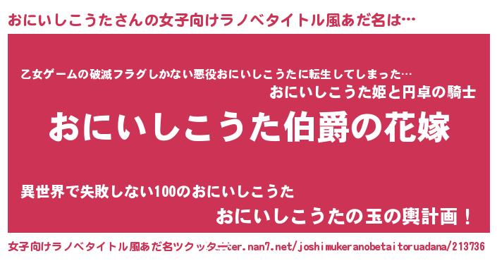 | 男性向けラノベタイトル風あだ名 | 『うちの娘の為ならば、俺はもしかしたらおにいしこうたも倒せるかもしれない。』 |