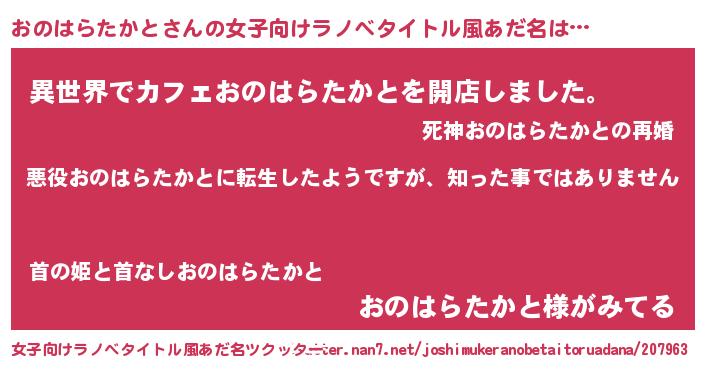 | 男性向けラノベタイトル風あだ名 | 『この素晴らしい世界におのはらたかとを!』 |