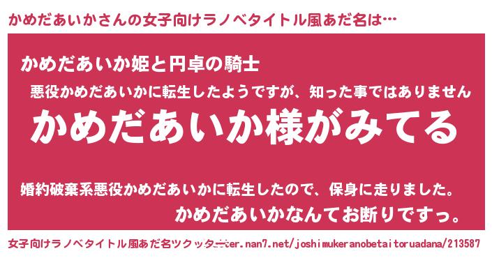 | 男性向けラノベタイトル風あだ名 | 『かめだあいかの嫁は女の子じゃないと思った?』 |