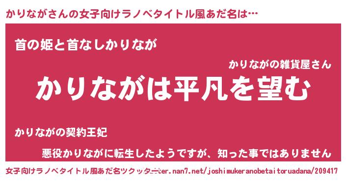 | 男性向けラノベタイトル風あだ名 | 『ダンジョンにかりながを求めるのは間違っているだろうか』 |