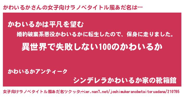 | 男性向けラノベタイトル風あだ名 | 『かわいるかという概念が存在しない退屈な世界 』 |