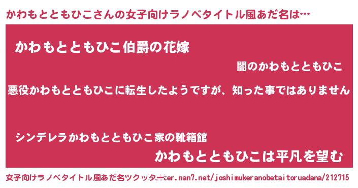 | 男性向けラノベタイトル風あだ名 | 『この素晴らしい世界にかわもとともひこを!』 |