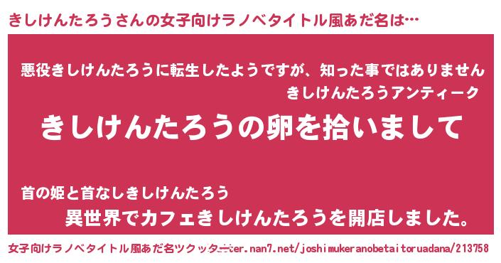 | 男性向けラノベタイトル風あだ名 | 『きしけんたろうの嫁は女の子じゃないと思った?』 |