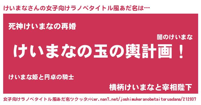 | 男性向けラノベタイトル風あだ名 | 『けいまな~年齢イコール彼女いない歴の魔法使い~』 |