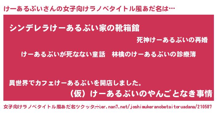 | 男性向けラノベタイトル風あだ名 | 『魔弾の王とけーあるぶい』 |