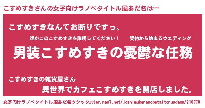 | 男性向けラノベタイトル風あだ名 | 『うちのこすめすきが世界を掌握している!』 |