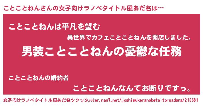| 男性向けラノベタイトル風あだ名 | 『うちのことことねんが世界を掌握している!』 |
