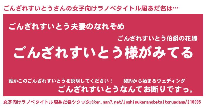 | 男性向けラノベタイトル風あだ名 | 『ごんざれすいとうの嫁は女の子じゃないと思った?』 |