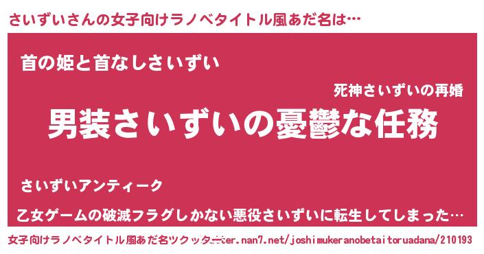 | 男性向けラノベタイトル風あだ名 | 『うちのさいずいが世界を掌握している!』 |