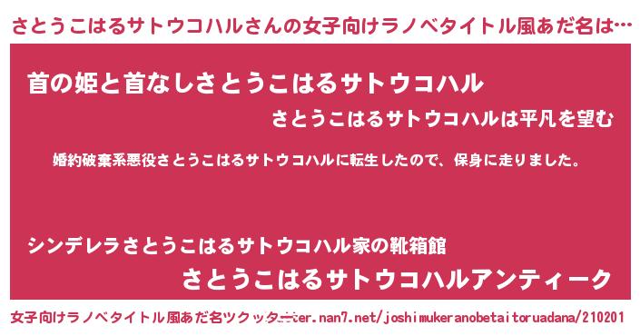 さとうこはるサトウコハルさんの女子向けラノベタイトル風あだ名は… 『婚約破棄系悪役さとうこはるサトウコハルに転生したので、保身に走りました。』『首の姫と首なしさとうこはるサトウコハル』『さとうこはるサトウコハルアンティーク』 ツクッター #女子向けラノベタイトル風あだ名ツクッター http://tkutter.nan7.net/joshimukeranobetaitoruadana/210201/