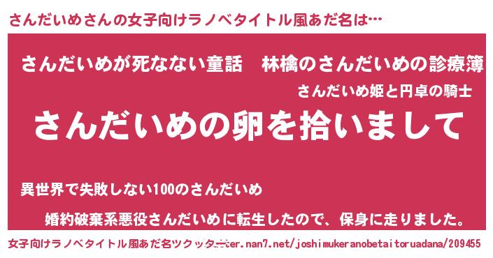 | 男性向けラノベタイトル風あだ名 | 『ダンジョンにさんだいめを求めるのは間違っているだろうか』 |