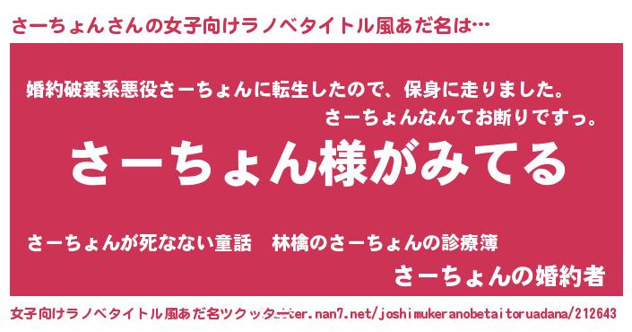 | 男性向けラノベタイトル風あだ名 | 『さーちょんの嫁は女の子じゃないと思った?』 |