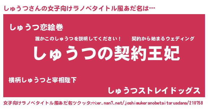 | 胡散臭い通販商品みたいなあだ名 | 『来世でも幸せになれる水素水…その名も「しゅうつ」』 |